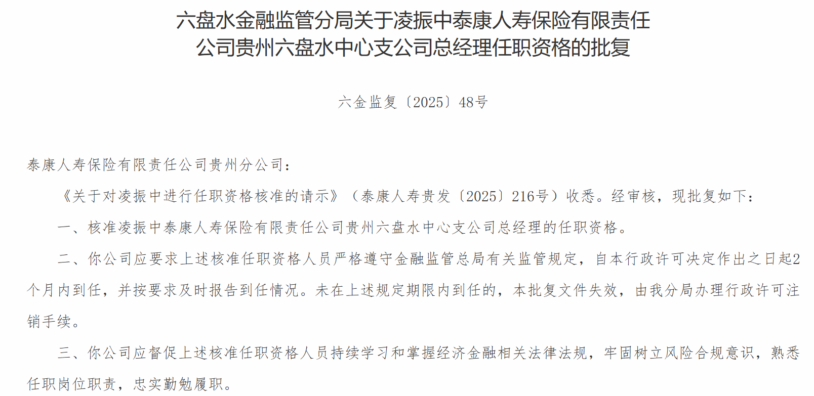 12月18日富源优配,六盘水金融监管分局发布关于凌振中泰康人寿保险有限责任公司贵州六盘水中心支公司总经理任职资格的批复,核准凌振中泰康人寿保险有限责任公司贵州六盘水中心支公司总经理的任职资格。