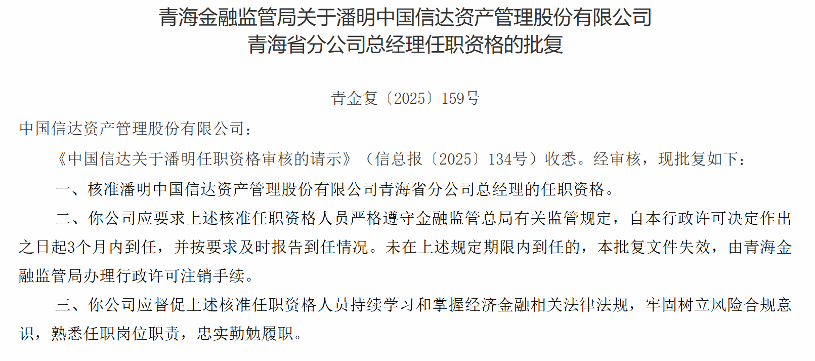 12月18日芒果配资,青海金融监管局发布关于潘明中国信达资产管理股份有限公司青海省分公司总经理任职资格的批复,核准潘明中国信达资产管理股份有限公司青海省分公司总经理的任职资格。